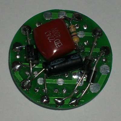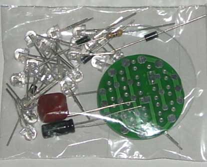 套件说明,罗口的电镀玻璃反光灯杯1只、圆型透明的平面封口玻璃1块、0.8mm高精度双面电路板1块、高亮白光草帽灯19只、400V224高压金属膜限流电容1只、1N4007整流二极管4只、4.7M高压泄流电阻1只、63V10UF消闪烁用滤波电容1只。
