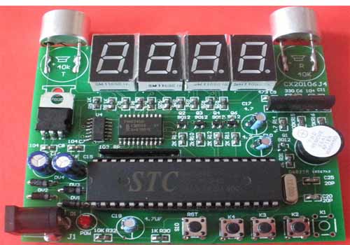 板上自带:超声波收发传感器、接收放大电路、四位LED数码显示、四位按键,电源部分自带整流、滤波、稳压电路,允许交流7~15V或者直流9~16V输入,经过实际测试,测量范围可达27~300厘米,测量精度为1厘米。因为我们能提供完整的源程序,客户不但可以学习超声波测距的知识,还可以直接将这项技术用于产品开发,是不可多得的资料。